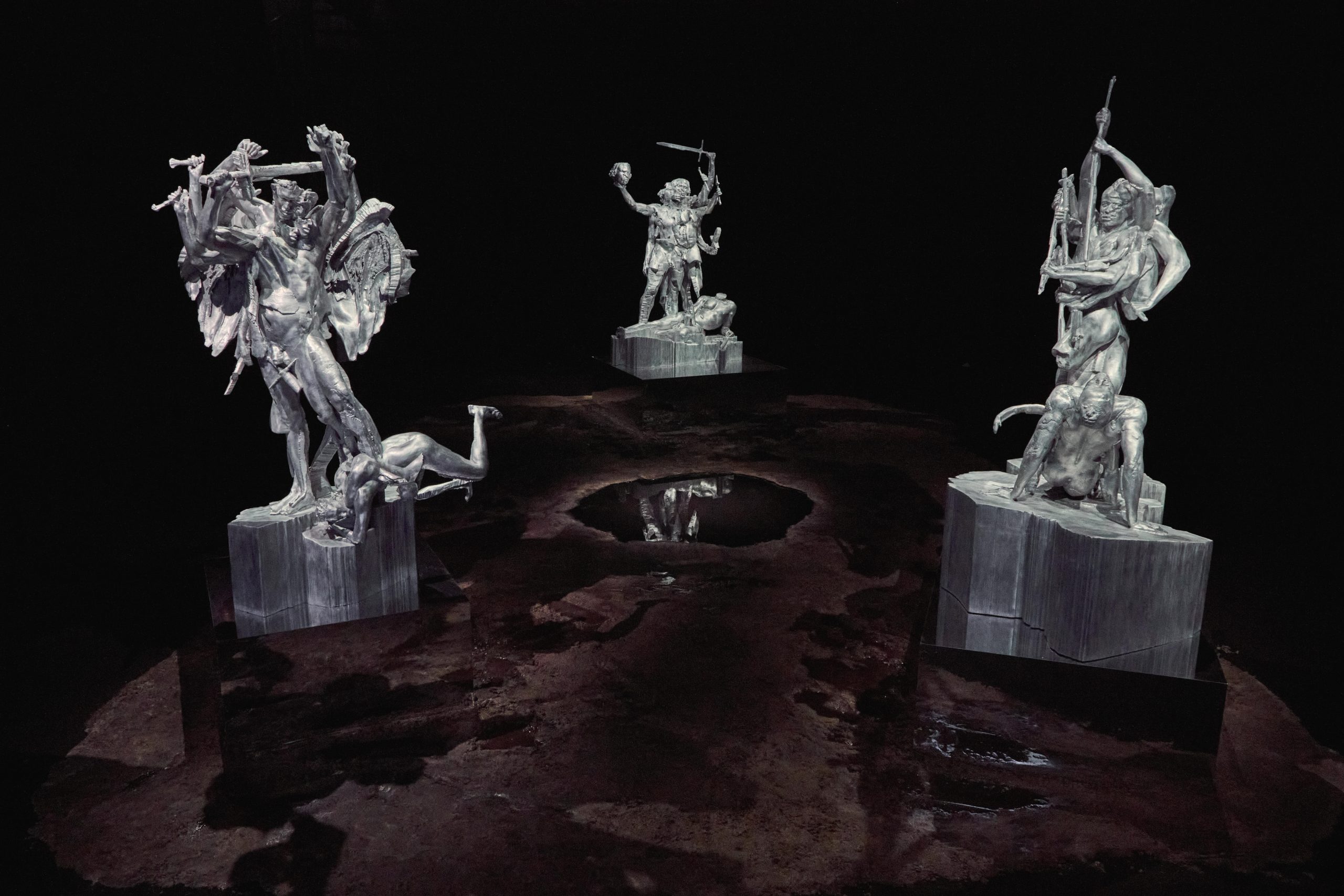 La chanteuse Yseult a interprété une performance de Miles Greenberg au milieu de son installation « Gods of Solaris » lors de l'ouverture de l'exposition du Mentorat 2025 à Reiffers Initiatives.