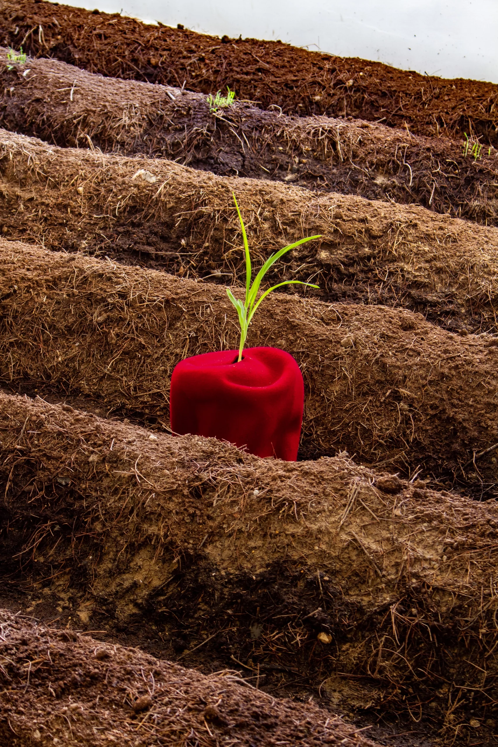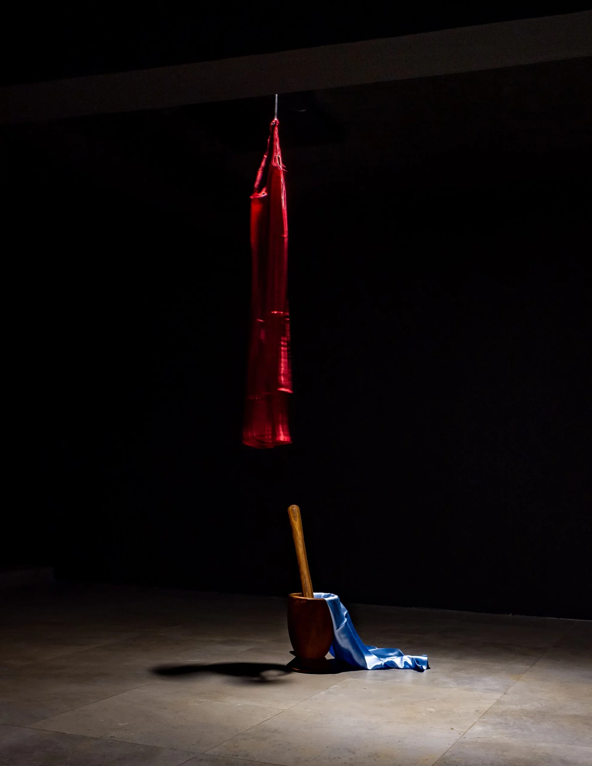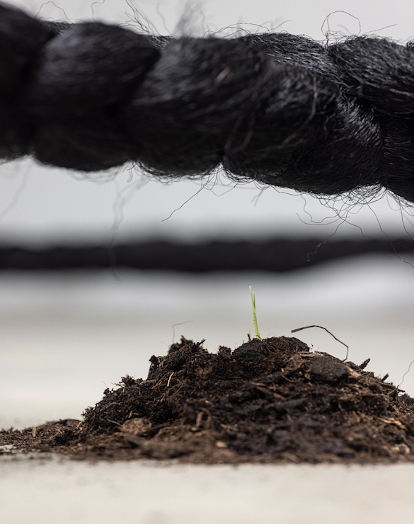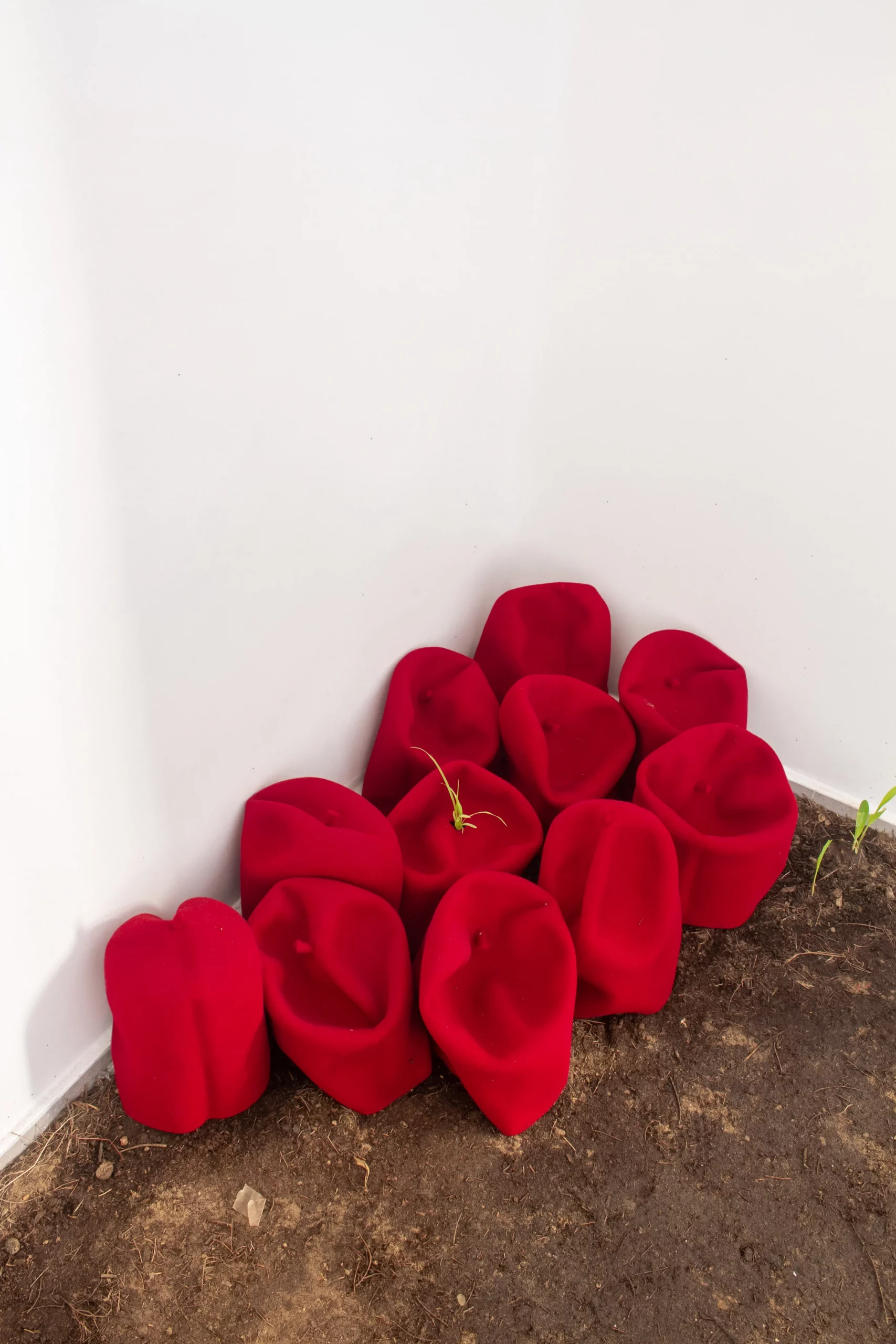 Terre, craie, cordes mais aussi cheveux synthétiques ou encore drapeaux roulés sont quelques-unes des matières qui forment le langage plastique de l’artiste. Binta Diaw accorde dans ses œuvres une grande place à l’expérience physique et sensorielle.