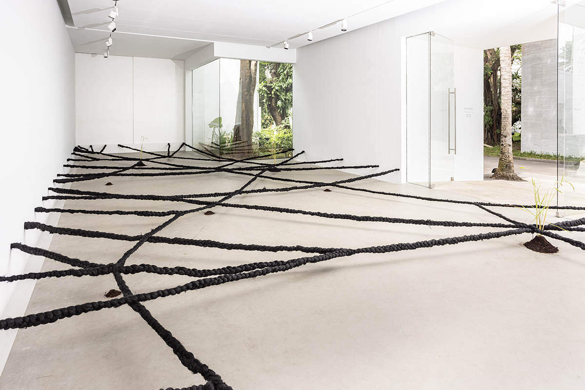 Chevelures, mangrove et racines : des œuvres qui se traversent Pour l’installation Dïà s p o r a (2021), l’artiste avait suspendu de longues tresses juste au-dessus du sol de la galerie Cécile Fakhoury d’Abidjan, en Côte-d’Ivoire. Comme des frontières sur une carte, les tresses créaient au sol des divisions et renvoyaient aux motifs complexes inscrits par les esclaves dans leur chevelure tressée. Ces motifs, en effet, n’ont pas seulement été conçus pour leur valeur esthétique : ils ont parfois été utilisés pour cartographier les chemins permettant de s’évader et d’atteindre un refuge. Souvent, la chevelure dissimulait aussi des graines, infimes promesses de survie en terre étrangère, formant ce que Diaw appelle une “diaspora botanique”. Dans l’exposition Dïà s p o r a, on voit de jeunes pousses de riz bien vertes émerger de petits monticules de terre, dans un poignant rappel de ce potentiel de croissance et de survie qu’offraient les semences migrantes. Diaw invitait également les visiteuses et les visiteurs à entrer dans l’œuvre, à enjamber ces frontières de cheveux tressés et ainsi, avec leurs corps, à relier les espaces entre eux.