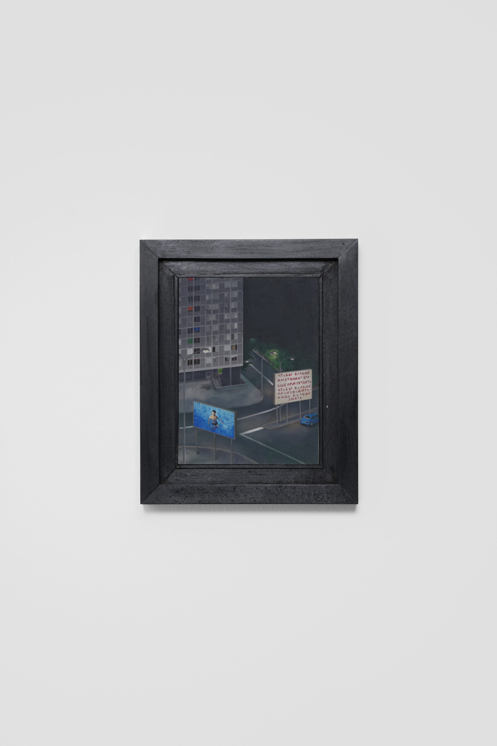 Car chez Claracq, l’histoire de la photographie n’est jamais loin. Citant Jeff Wall parmi ses références, il assume dans sa pratique cette même position ambiguë entre l’imprévisibilité du réel et la fiction de la mise en scène. Si ses sujets s’apparentent à des scènes intimes du quotidien volées à travers la vitre d’une fenêtre, ils sont en vérité le fruit d’assemblages d’images glanées par l’artiste qui composent un nouvel imaginaire. Dans ses espaces délimités par des lignes verticales, horizontales et obliques, Claracq crée des mises en abyme où les cadres se trouvent à l’intérieur des cadres, depuis un imposant panneau publicitaire jusqu’au format carré d’une photographie Instagram que l’on discerne, minuscule, au sein d’un écran numérique. Les architectures urbaines quadrillées, que le peintre affectionne tant, se prolongent alors dans les formes qui régissent le champ des images et du numérique pour constituer un même monde orthogonal.“