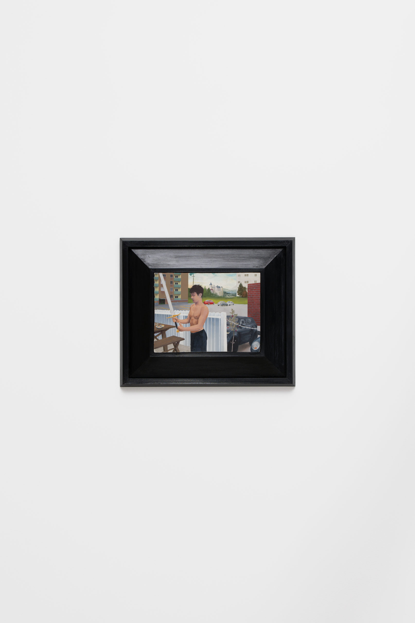 empruntent des techniques historiques pour dépeindre des personnages ultra contemporains. Dans l’œuvre de cet artiste français, tout est réduit : les villes et les objets tiennent dans le format d’une carte postale, et les jeunes hommes deviennent les figurines de ce monde en miniature. Alanguis par l’attente ou le repos, perdus dans leurs pensées, ces derniers apparaissent tantôt les yeux rivés