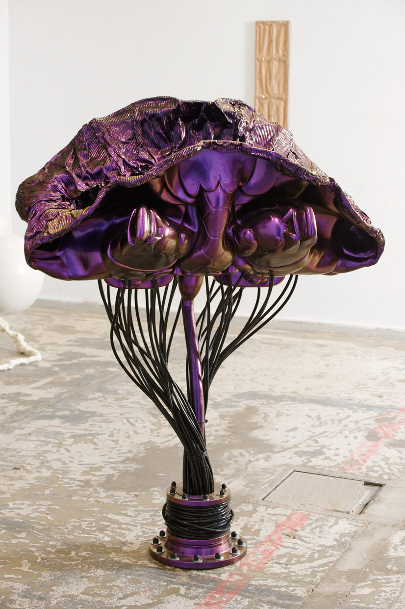 Enserrant un ventre mou, des filaments anguleux se tordent sur eux-mêmes. Une tête-fleur de consistance spongieuse les chapeaute. D’un vert brunâtre, l’arabesque végétale luit d’un éclat métallique : couleur carrosserie de voiture ou ventre de scarabée. Ce végétal post-nucléaire (Love the Human Smell, 2018), on l’apercevait déjà lors de MENU, l’exposition solo de Julie Villard & Simon Brossard à la galerie Exo Exo à Paris. Les deux jeunes artistes, qui travaillent ensemble depuis leur rencontre aux Beaux-Arts de Cergy en 2016, hérissaient alors l’espace d’une ribambelle de ces structures arc-boutées et contorsionnées.”