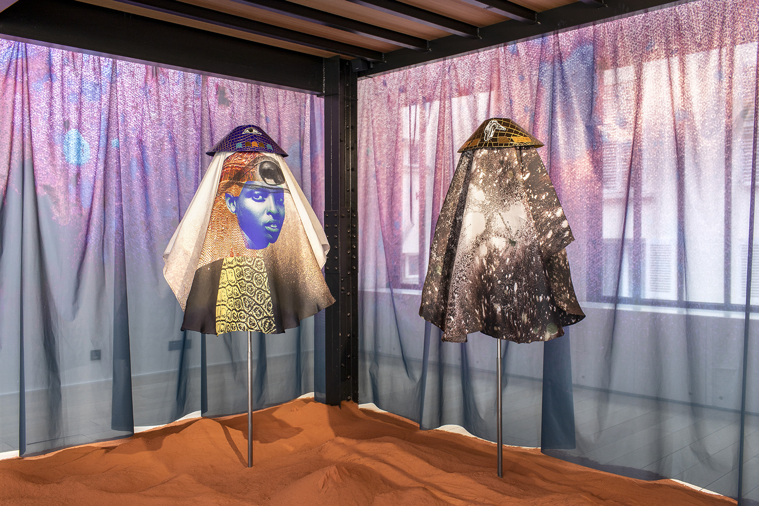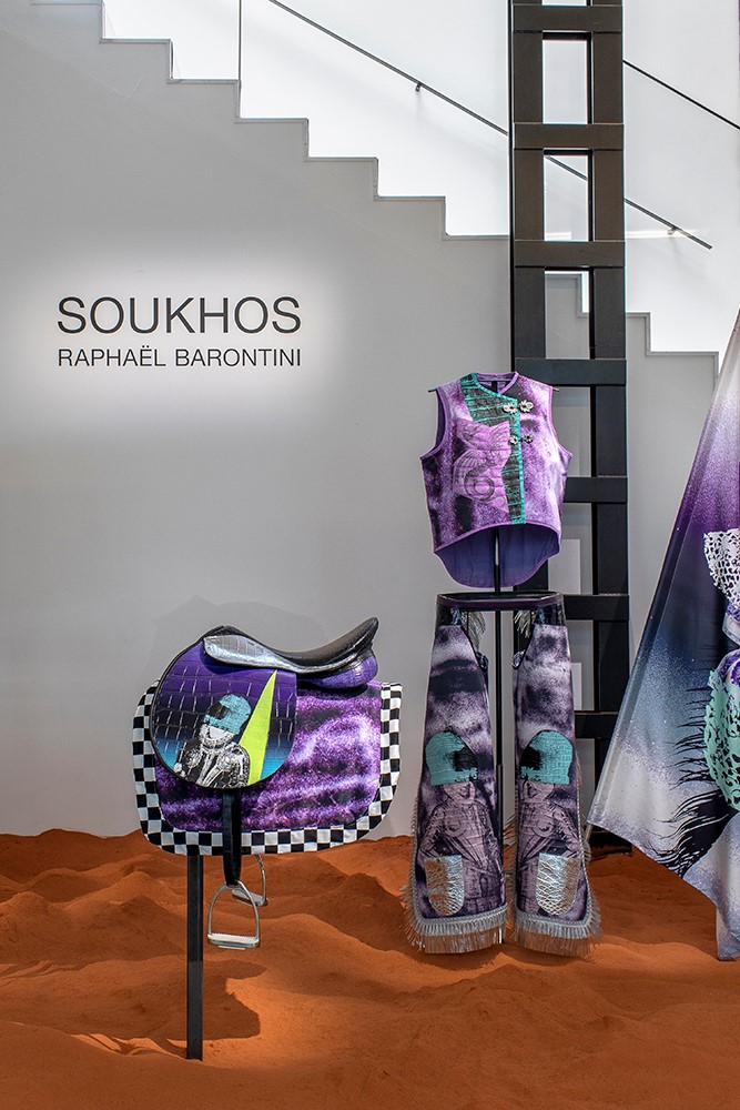Après huit mois en apnée en Asie, dont plusieurs semaines confiné devant sa machine à coudre, il a produit des « pièces à porter », exposées jusqu’à fin juillet au Studio des Acacias, à Paris. Ces selles d’apparat, capes et collerettes n’ont pas vocation à être déclinées en collection. Plus qu’un hymne au luxe, elles sonnent comme un hommage à Sun Ra, ce jazzman cosmique habillé en pharaon, qui, dans les années 1970, voulait sauver les Noirs opprimés sur terre en les envoyant dans l’espace.