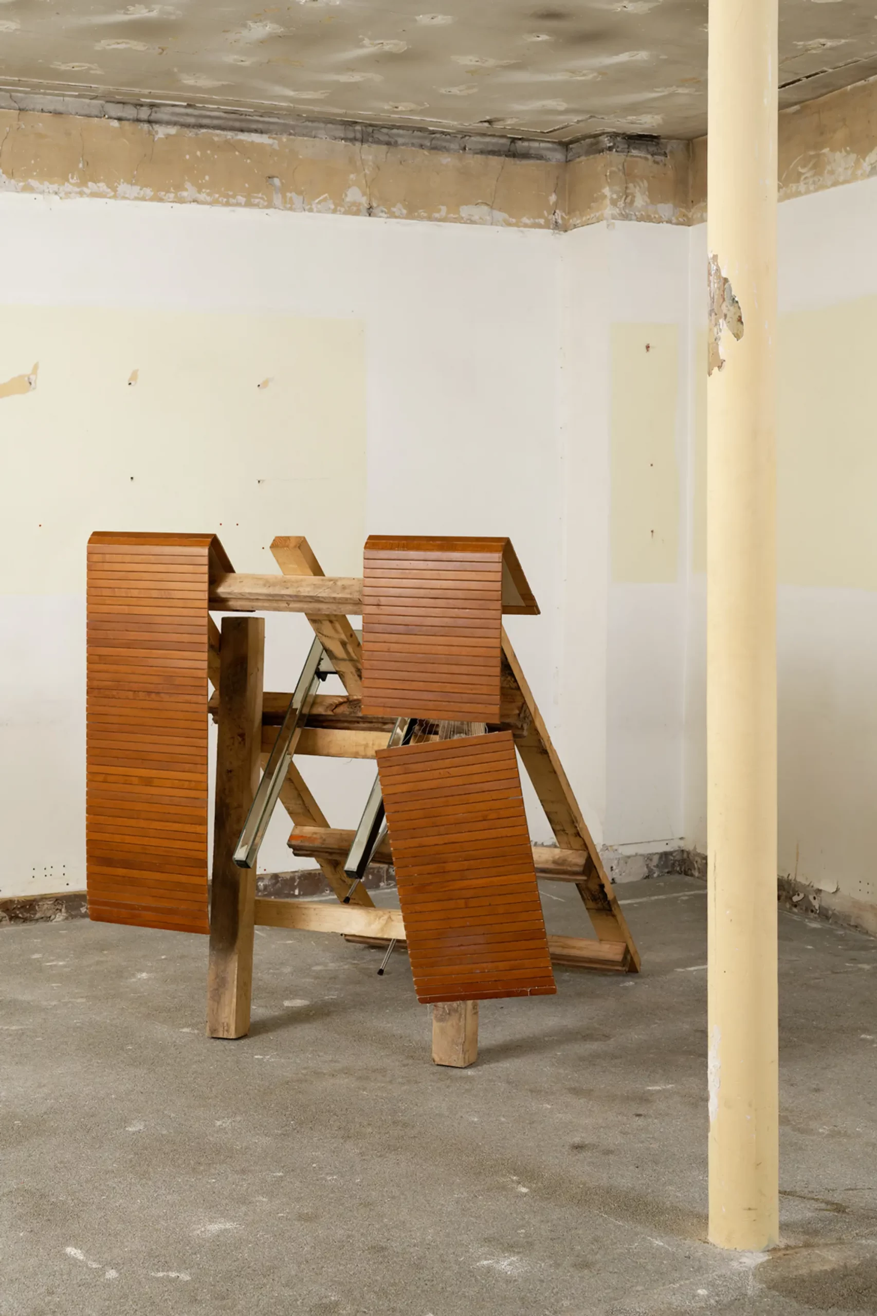 Là, le même processus s’écrit en élévation, atteignant une qualité quasi-mystique alors que la lumière changeante du jour vient baigner, sur les deux étages, les assemblages monumentaux précaires. Réalisés sans colle ni clou, ils témoignent de ce que l’artiste qualifie d’une performance ou d’une chorégraphie privée, désignant le moment où, suite à son processus de glanage, celle-ci s’enferme la nuit dans la galerie – aidée de caféine ou de boissons énergisantes – afin de se livrer au travail de composition en tant que tel, réalisé en quelques heures. S’il en va d’une démonstration de force, réappropriée à la rhétorique testostéronée des sculpteurs mâles de l’histoire, catégorie bien établie des promos d’écoles d’art d’aujourd’hui encore – la qualité formelle déborde la simple maestria gestuelle.