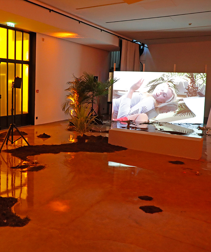 Laure Prouvost’s immersive films, installations, drawings and wallpapers, combining the representation of desire, onirism and a fantasized description of nature, jeopardize our relationship to language and understanding through the intrication of complex narratives and surrealist moments that feed her unusual approach to the conventions of cinema and image.