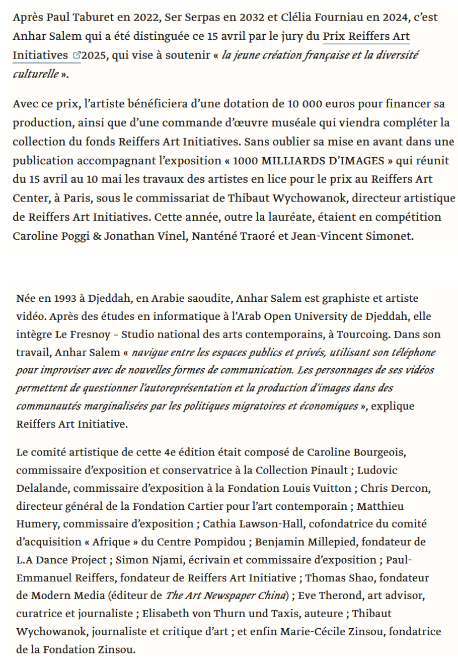 Anhar Salem lauréate du Prix Reiffers Art Initiatives 2025